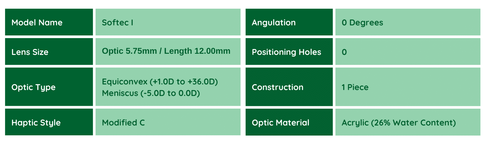 The Softec I intraocular lens (IOL) has been trusted for years by ophthalmologists worldwide and has stood the test of time, delivering reliable performance time and time again whilst providing exceptional value.
